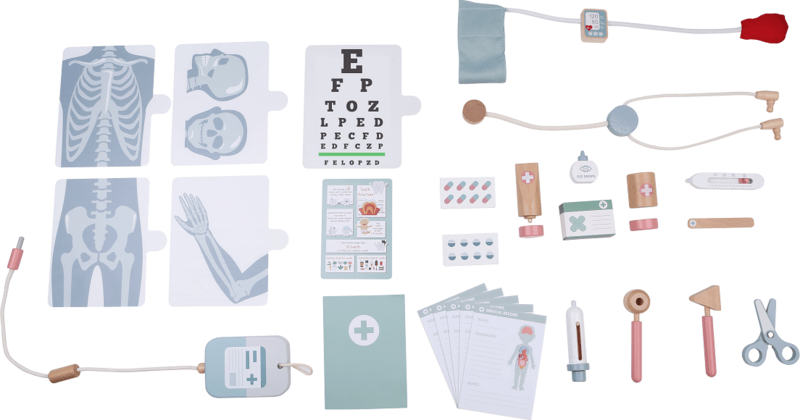 - Un stéthoscope, un tensiomètre, un thermomètre, une pince à épiler, des boîtes pour médicaments et crèmes, des ciseaux, une perfusion, 4 radiographies, un otoscope, une seringue, un marteau, des fiches patients, des cartes de médicaments, un tableau de contrôle de la vue et des brochures informatives.