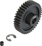 Arrma pignon en acier de 39 dents, module M1, ouverture Safe-D8. L'ouverture en forme de 'D' correspond au profil de l'arbre du moteur avec un arbre de 8 mm et une rainure, donc le pignon ne peut pas glisser sur l'arbre. Vis de fixation - M4 x 4 mm, circlip 6 mm. Profil de dent large fabriqué avec précision pour un fonctionnement fluide.
