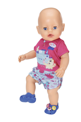 La capitaine du bateau Berta maintient le cap vers la salle de bain, tandis que l'ours en peluche Bruno se baigne dans les vagues... C'est ainsi ou de manière similaire que pourrait commencer l'histoire racontée par l'impression sur le haut du pyjama. Les culottes de l'ensemble sont décorées d'un motif de parc aquatique. Pour que les petits pieds ne se refroidissent pas sur les carreaux froids, BABY born porte des pantoufles bleues avec de jolis ornements.