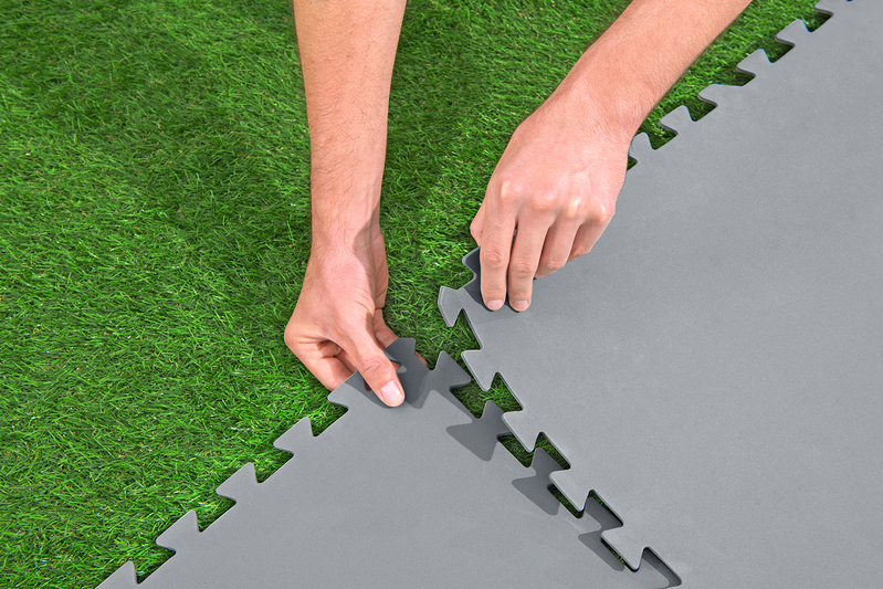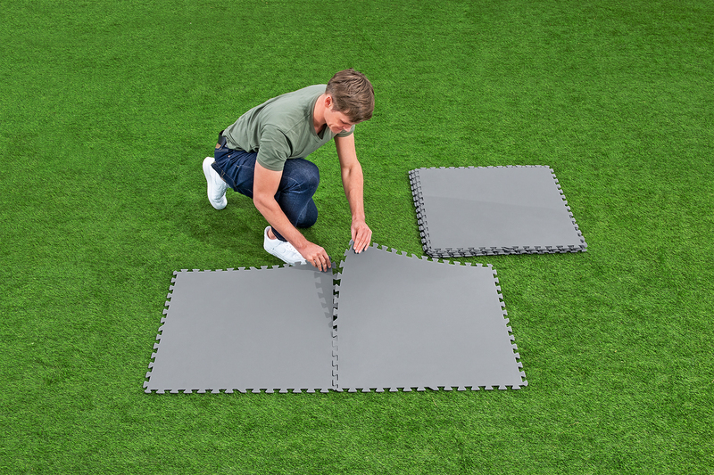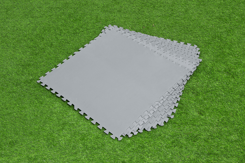 Donnez à votre espace piscine une base solide avec la protection de fond de piscine Bestway® et protégez le fond de la piscine et la pelouse. Cet ensemble composé de 9 dalles (chacune mesurant 78 x 78 cm) vous permet de créer un espace piscine à la fois stylé et fonctionnel d'une superficie totale d'environ 5,47 m2. Ces éléments de protection de fond sont fabriqués en polyéthylène durable et sont conçus pour offrir une protection durable. Non seulement ils protègent le fond de votre piscine contre l'usure et les dommages, mais ils protègent également la pelouse en dessous. Grâce à un système de glissement extensible, vous pouvez personnaliser et agrandir l'espace selon vos besoins.