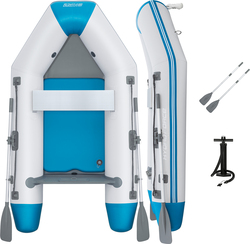 Des anneaux de remorquage en acier offrent une stabilité et une flexibilité supplémentaires. Le banc en aluminium promet confort et durabilité. Un support pour un bidon d'essence et un support de moteur résistant à l'eau salée en contreplaqué (adapté aux moteurs jusqu'à 15 chevaux, moteur non inclus) sont également disponibles, rendant le bateau prêt pour diverses aventures.