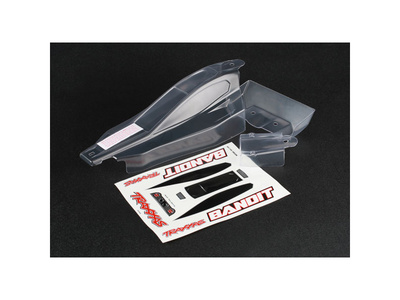 Carrosserie en lexan non peinte pour le modèle RC de la voiture Traxxas Bandit. La partie avant et la partie arrière sont séparées. L'emballage contient également une feuille d'autocollants.
