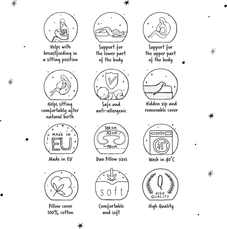 Cebuška DUO – coussin multifonctionnel est destiné aux mamans les plus exigeantes du monde. C'est le plus grand coussin pour femmes enceintes et mères allaitantes. Son innovation réside dans sa construction en deux parties et l'utilisation de deux rembourrages différents.