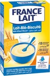 Complément alimentaire à base de céréales pour les nourrissons et les jeunes enfants à partir de 6 mois. Contient 13 vitamines et 11 minéraux. Contient du gluten. A un excellent goût. Se prépare uniquement avec de l'eau.Les bouillies lactées à base de céréales FRANCE LAIT ont été développées par des experts en nutrition pour les nourrissons qui commencent à diversifier leur alimentation. Le lait maternel ou le lait infantile reste la base de l'alimentation infantile – si la mère ne peut pas allaiter pour diverses raisons. Les bouillies lactées FRANCE LAIT sont facilement digestibles et enrichies en nutriments pour une croissance et un développement sains de l'enfant : protéines, glucides complexes, vitamines et minéraux. À partir de 6 mois, l'alimentation de l'enfant peut être complétée par une quantité appropriée de légumes, de poissons et de viande. UtilisationInstructions d'utilisation :1. Faites bouillir de l'eau propre et fraîche – environ 10 min. et laissez refroidir à une température maximale de 40 °C.2. Selon le tableau de dosage, versez dans un bol la quantité d'eau tiède correspondant à l'âge de l'enfant.Ajoutez le nombre recommandé de cuillères à soupe de bouillie lactée de blé FRANCE LAIT.3. Mélangez le contenu du bol pour obtenir une consistance lisse et crémeuse. La bouillie peut être servie chaude ou froide.Préparez juste avant le repas. Jetez les restes non consommés de bouillie. Emballage250g IngrédientsFarine de blé partiellement hydrolysée (57,5 %), lait écrémé en poudre (24,8 %) – de France, sucre, miel (4 %), huile végétale (palme), minéraux (carbonate de calcium, phosphate de potassium, phosphate de magnésium, chlorure de calcium, phosphate de sodium, gluconate de zinc, pyrophosphate ferrique, sulfate de manganèse, gluconate de cuivre, iodure de potassium), vitamines (A, D, E, C, B1, B2, B6, B12, B3, acide folique, B5, biotine, K), maltodextrine, arôme : vanilline, antioxydant : palmitate d'ascorbyle, extrait riche en tocophérols. AvertissementLa bouillie lactée de blé FRANCE LAIT ne remplace pas le lait maternel.Ne pas ajouter de lait ni de sucre lors de la préparation de la bouillie FRANCE LAIT, car ils font partie des ingrédients. Après avoir prélevé la dose recommandée de bouillie, fermez hermétiquement le sachet et remettez-le dans la boîte en carton. Conservez dans un endroit sec, à l'abri de la chaleur. Emballé dans une atmosphère protectrice. À consommer dans les 3 semaines suivant l'ouverture.
