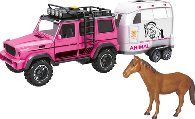 CITY SERVICE CAR - 1:14 - Véhicule tout-terrain rose avec remorque et cheval avec son et lumières
