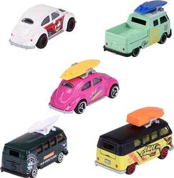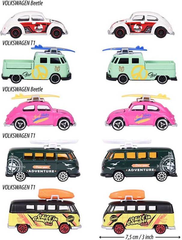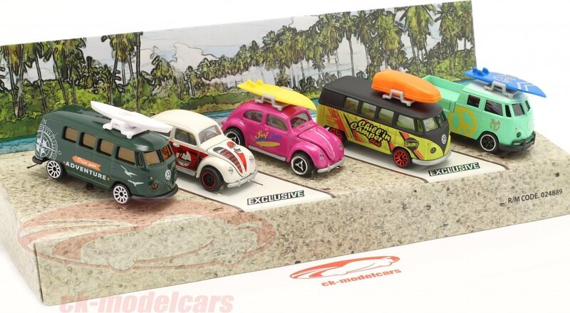 Ensemble-cadeau avec 5 modèles réduits de voitures en métal officiellement licenciés par Volkswagen, deux modèles exclusifs, avec des parties mobiles/ouvrantes, en roue libre avec suspension.