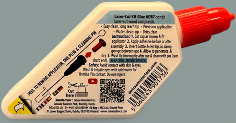 La colle Laser-Cut de Deluxe Materials est conçue pour un collage simple et efficace des maquettes en bois et éventuellement en plastique, qui ont été découpées au laser ou usinées avec une fraiseuse CNC. Application avec un applicateur à aiguille ! Contenu 25 ml.
