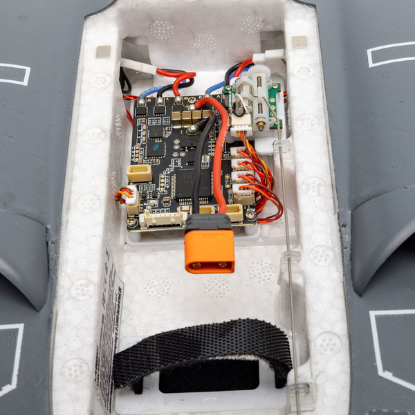 Le fuselage de l'avion, en matériau EPO résistant, contient des renforts composites à l'avant et sur toute la longueur du fuselage, les bords d'attaque et les extrémités des ailes étant renforcés par des pièces en plastique pour la protection. Sa conception soigneusement élaborée le rend stable pour un vol normal et étonnamment agile pour réaliser des acrobaties, des loopings, des tonneaux ou voler sur le dos. La différenciation de la poussée des moteurs contribue également à une excellente maniabilité, compensant l'absence de gouvernail. Pour une stabilité accrue, vous pouvez également installer un stabilisateur vertical.