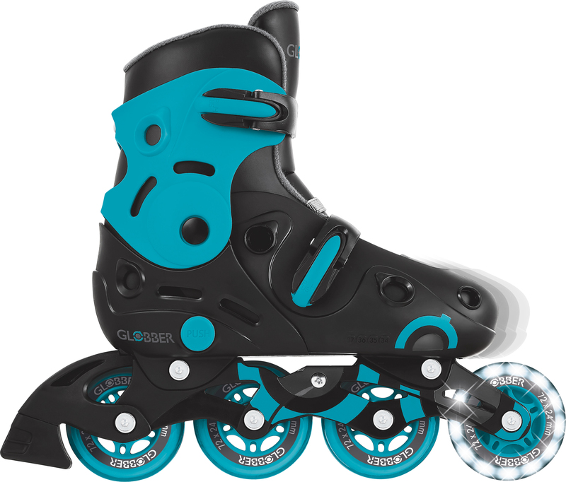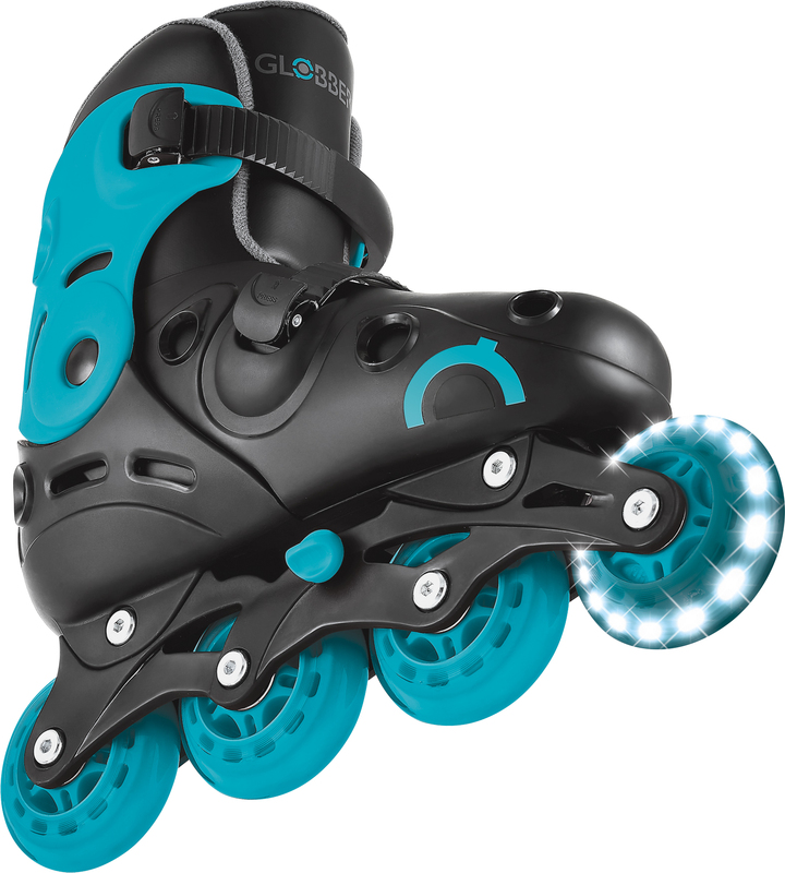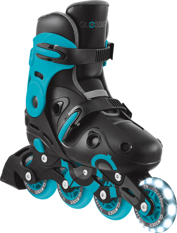 Patins à roulettes ajustables et confortables avec un design exclusif Globber pour les jeunes patineurs.