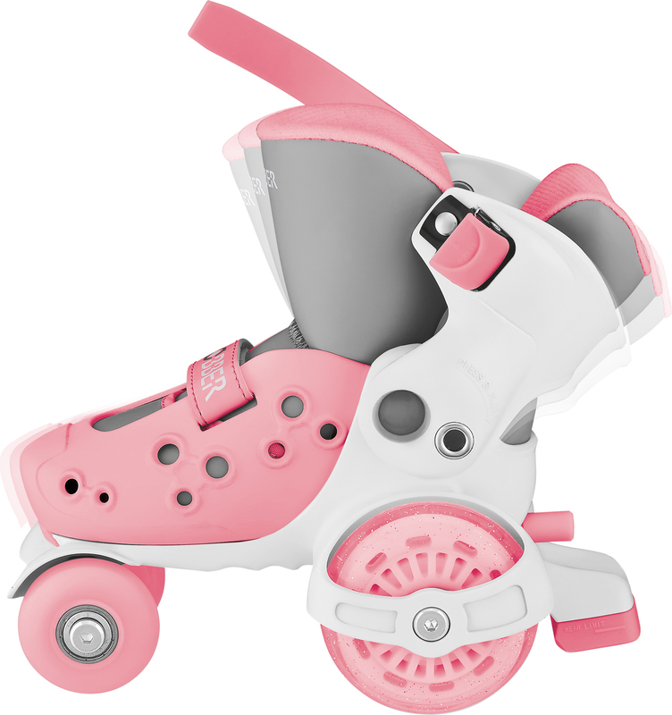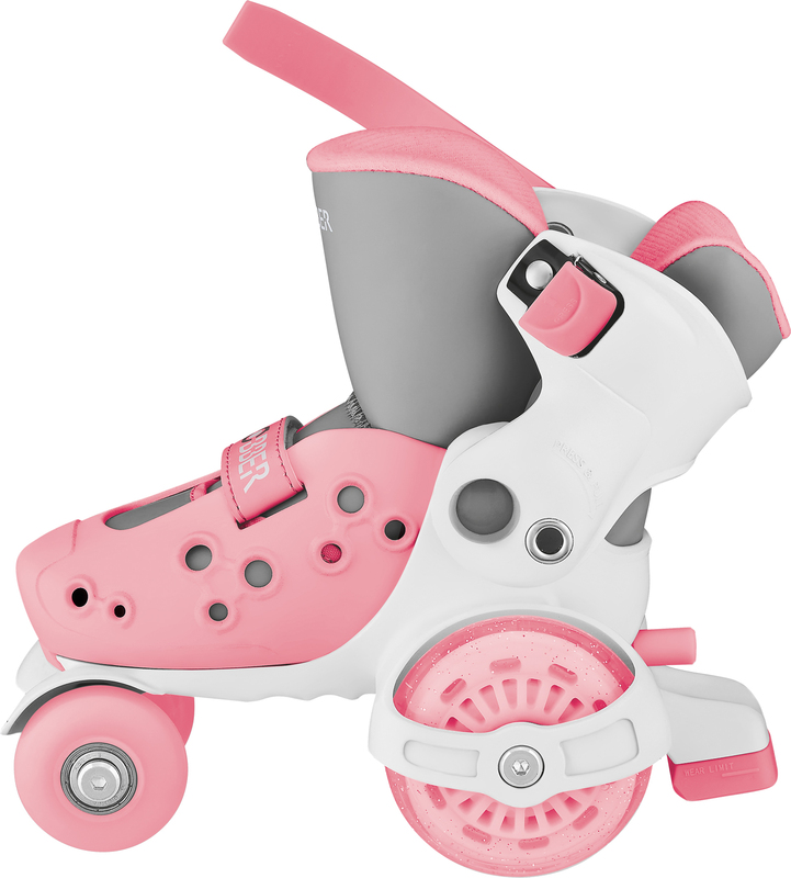 Le réglage de la taille est 100 % sans outils — grâce aux boutons de réglage de la longueur et aux bandes de fixation supplémentaires, les patins s'adaptent rapidement et facilement aux petits pieds en croissance. Les chaussures se mettent facilement, sont rembourrées de velours doux et de matériau EVA pour un confort maximal. Quatre roues PU très résistantes sur roulements ABEC 9 assurent une conduite fluide et stable — les roues avant sont plus petites (pour un mouvement plus lent et un meilleur contrôle), les roues arrière sont plus grandes et scintillantes pour une stabilité et un amusement supplémentaires. Chaque patin est équipé d'un frein solide en matériau TPR, permettant un arrêt sûr et immédiat.