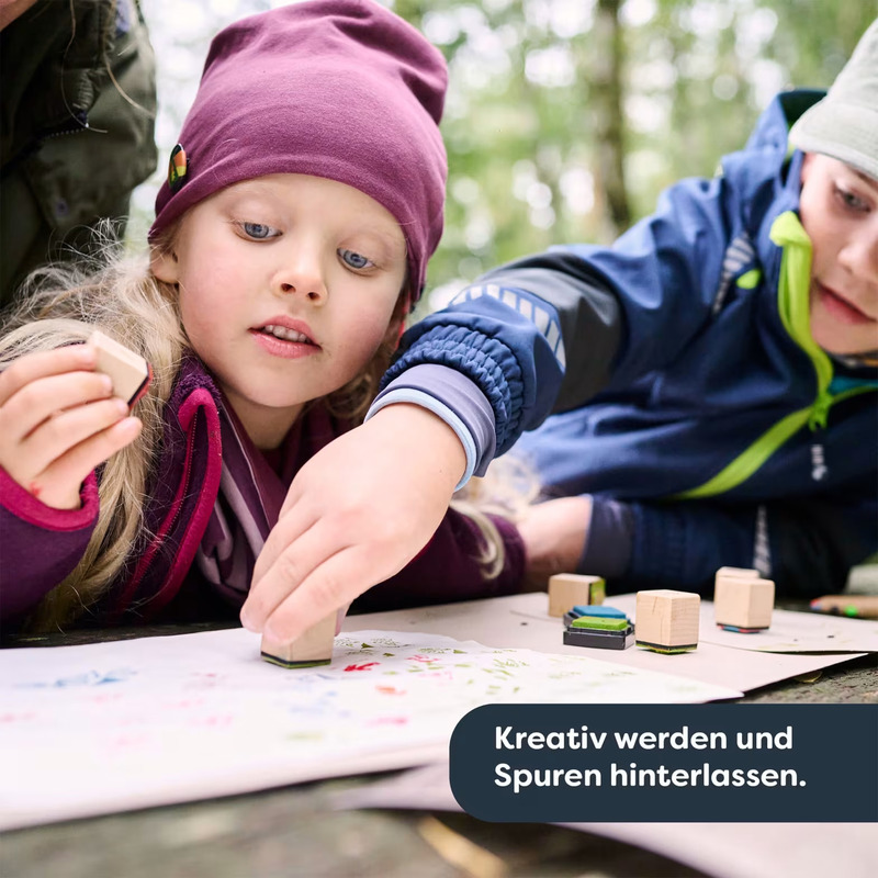 Tout d'abord, il est temps de créer : avec 8 motifs de tampons, les enfants peuvent réaliser leur propre carte au trésor d'aventure sur papier, carton ou tissu – sans limites à leur imagination.