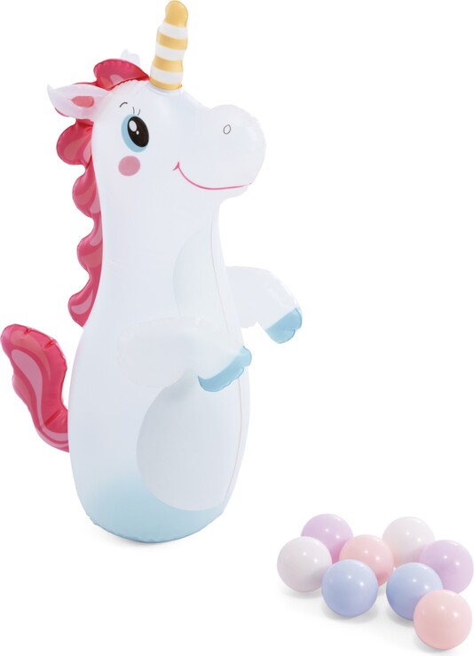 Il est également accompagné d'un jouet de boxe gonflable (Bop bag) en forme de licorne et de 8 balles colorées que les enfants peuvent lancer à travers l'anneau sur l'arc du château.