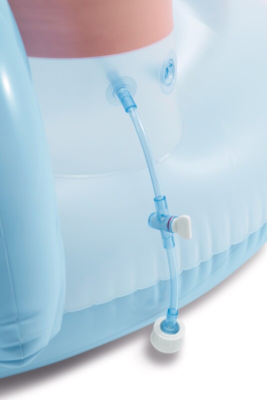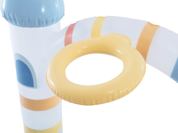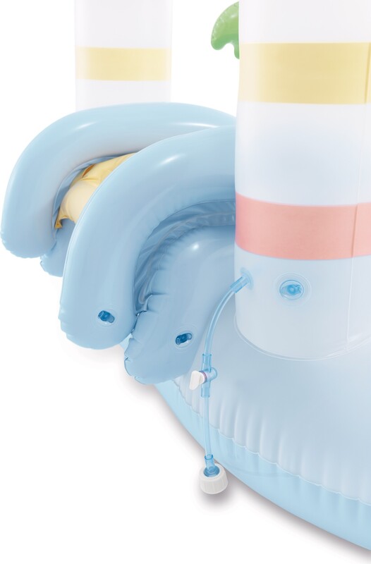 Il comprend un toboggan avec un rembourrage supplémentaire dans la zone de chute et un arc en forme de château qui se transforme en brumisateur doux lorsqu'il est connecté à un tuyau de jardin.