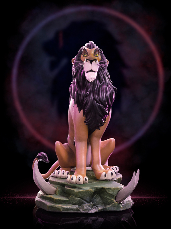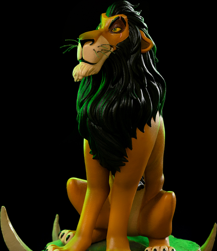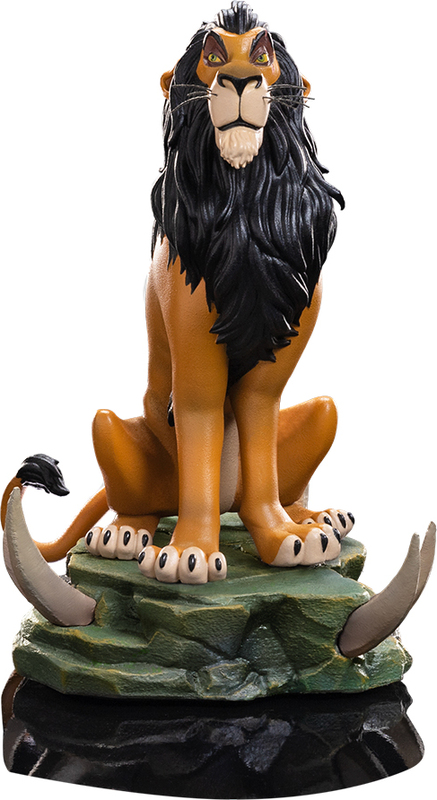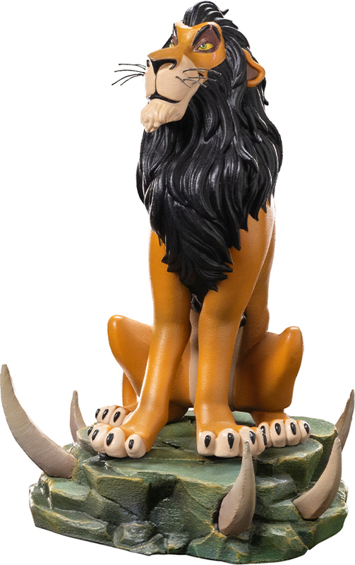 La figurine Scar – Le Roi Lion – Art Scale 1/10 de Iron Studios représente l'iconique méchant du film d'animation Le Roi Lion – le 32ème long-métrage d'animation du studio Walt Disney Pictures sorti en 1994. Ce félin élancé avec un pelage brun, une crinière noire, des yeux verts et une cicatrice marquée au-dessus de l'œil gauche est assis au sommet d'un rocher sur une base ornée de cônes d'ivoire, faisant référence à l'atmosphère sombre du cimetière des éléphants. La figurine a été publiée à l'occasion du 100ème anniversaire de Disney.