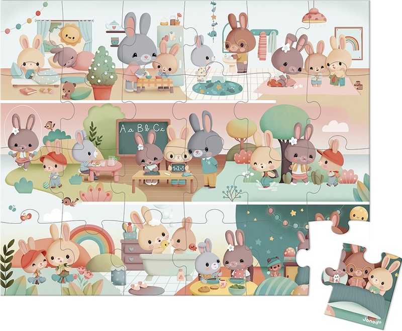 Vivez une journée entière avec la famille de lapins, du réveil matinal à la lecture du conte du soir à partir d'un livre de contes. Ce joli puzzle en carton de 24 pièces aidera votre enfant à se repérer dans le temps et à identifier les rituels quotidiens : le réveil, s'habiller, partir à l'école et se préparer à dormir.