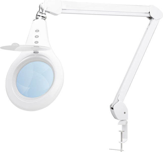 Lampe de bureau LED Lightcraft économe en énergie avec loupe ronde, pour lumière du jour avec des lentilles de haute qualité. Bras articulé flexible à long portée pour un positionnement précis sans glissement. Lentille de 125 mm de haute qualité, 3 dioptries (1,75x d'agrandissement). 56 LED SMD avec une température de couleur de 6000 - 7000K et un CRI de 90, consommation seulement 11W, alimentation secteur.