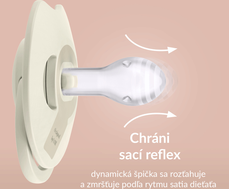 La tétine dynamique s'étire et se rétracte grâce à une construction unique en silicone de différentes épaisseurs, selon le rythme de succion de l'enfant. Cela protège son réflexe de succion et n'a pas d'effet néfaste sur l'allaitement. La forme symétrique de la pointe est inspirée de la forme d'un mamelon rempli de lait, offrant au bébé une sensation familière similaire à celle du sein.