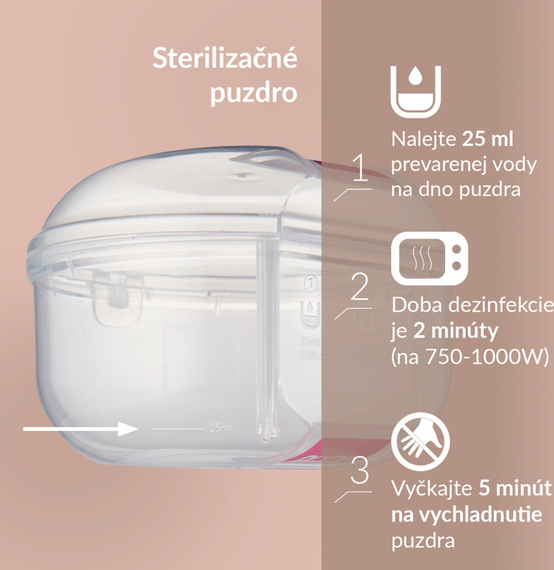 Instructions pour désinfecter la tétine dans le boîtier de désinfection : AVERTISSEMENT ! Le non-respect de cette instruction peut entraîner des brûlures ou des dommages au produit et/ou au micro-ondes. Avant utilisation, vérifiez toujours le niveau d'eau dans le boîtier de désinfection. Il est possible de désinfecter deux tétines à la fois dans le boîtier. Ce produit n'est pas un jouet. Utilisez et conservez le produit hors de portée des enfants.
