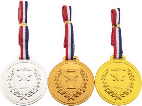 Ensemble de trois médailles avec un ruban. Les enfants peuvent concourir dans différentes disciplines avec l'espoir de monter sur le podium et d'être récompensés par des médailles.