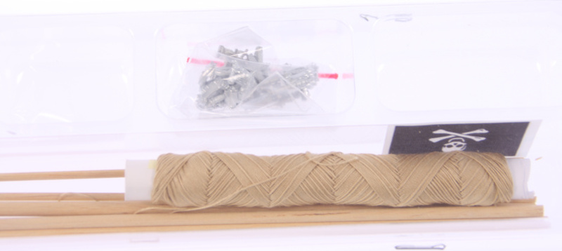 L'emballage contient un semi-fini de coque, des pièces en contreplaqué (y compris des pièces pour le support du bateau), des lattes en bois, un blister avec de petites pièces, un ensemble de dessins et un manuel détaillé de construction en anglais.