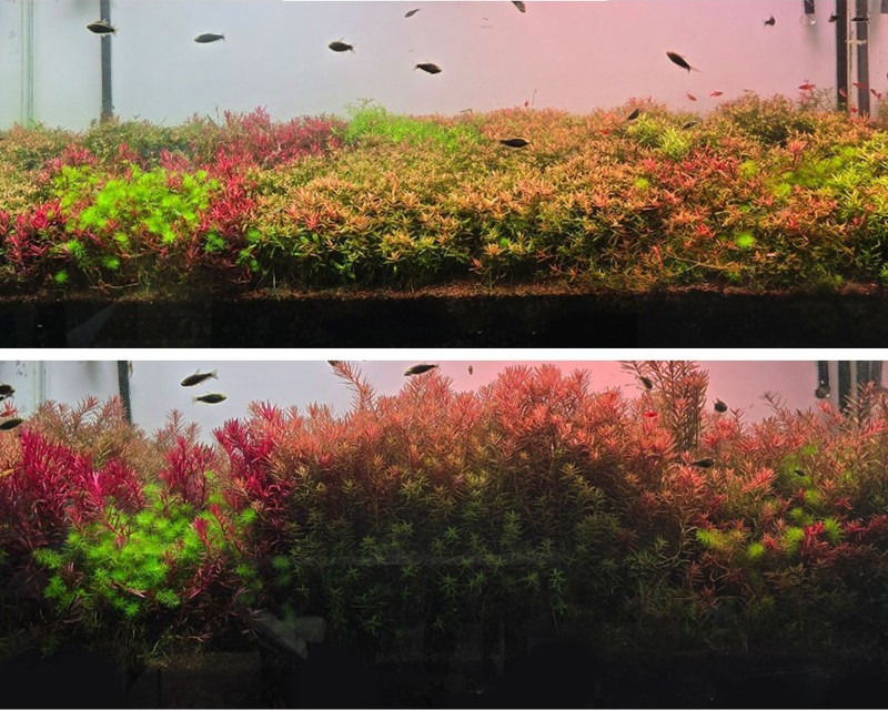 - Intenzívny rast rastlín – vrátane náročnejších červených druhov a rastlín vhodných do predného plánu, bez akéhokoľvek externého CO2
