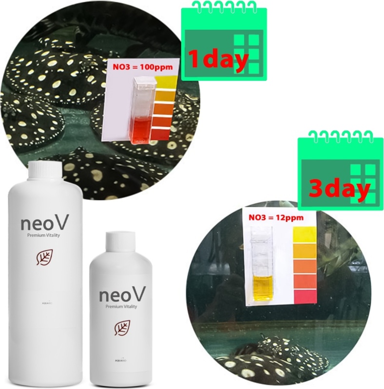 - Réduction des nitrates : Dans un aquarium stable et cyclique, Neo V peut réduire le niveau de nitrates jusqu'à 87 % quelques jours après l'application, contribuant ainsi à une eau plus propre et plus saine.