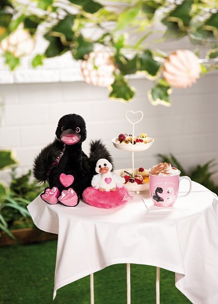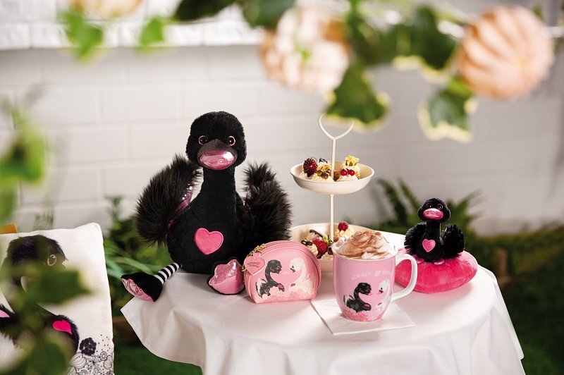 - Un cygne noir avec un bec, des intérieurs d'ailes et des pattes en matériau rose scintillant, un cœur appliqué et des yeux scintillants magiques. Un cadeau idéal pour une personne unique !