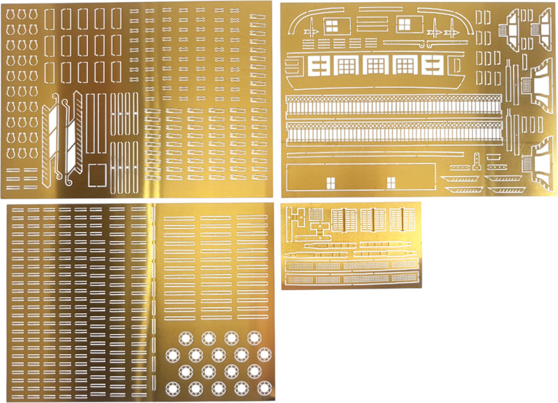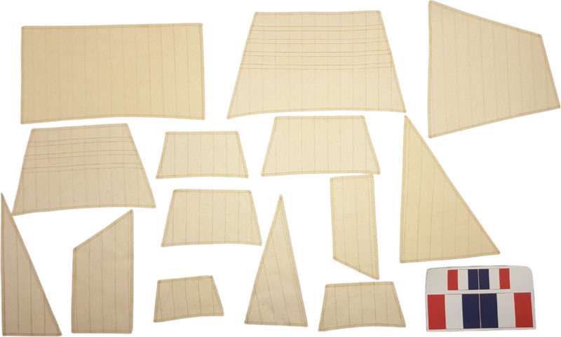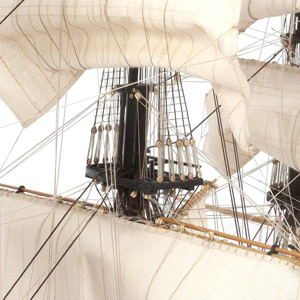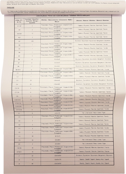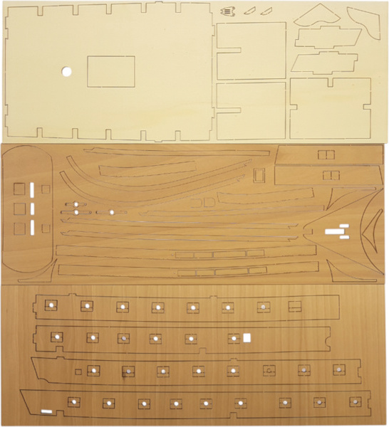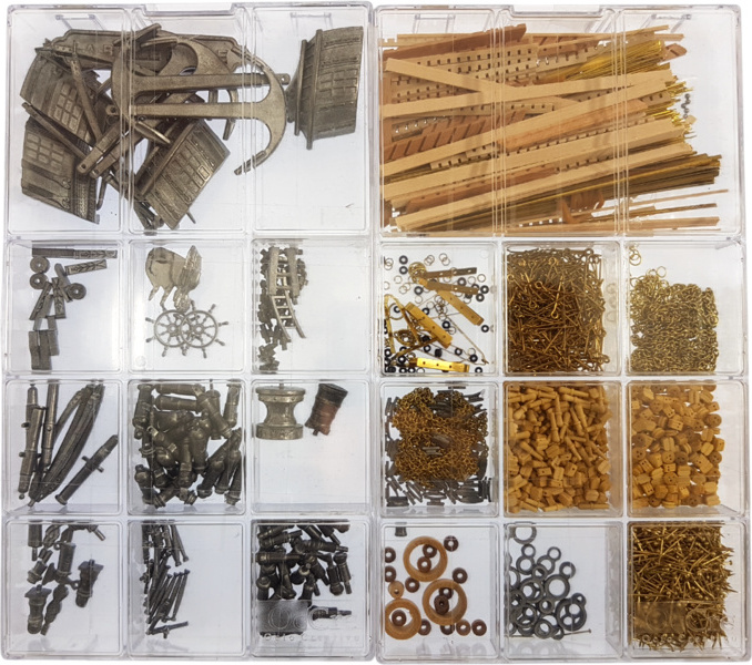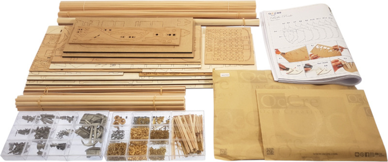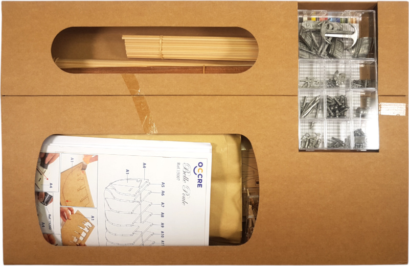 L'emballage contient des pièces en bois découpées au laser, des lattes, un pont, des mâts, des pièces en bois, des pièces en métal coulé, des pièces en laiton, des photodécoupes en laiton, du gréement, des voiles cousues, des drapeaux, un support. Manuel et plans de construction.