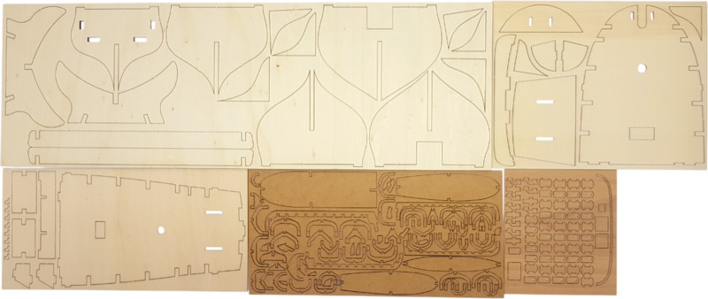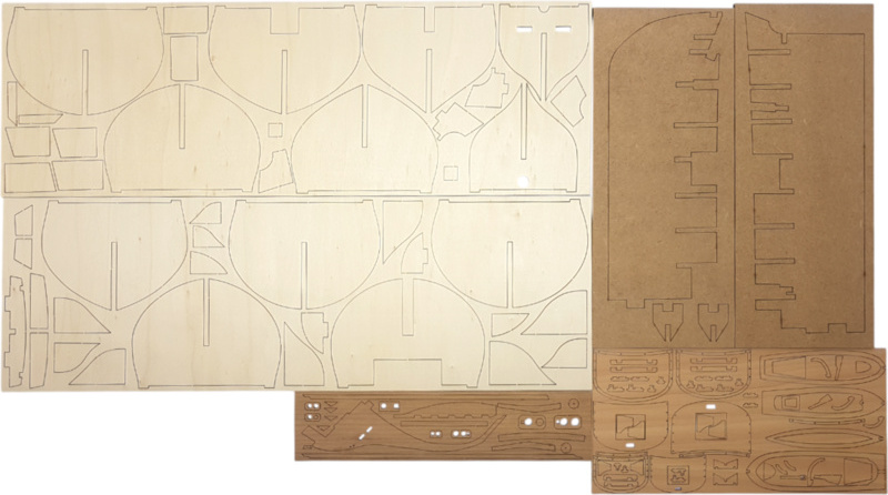 En ouvrant le couvercle de la boîte, vous trouverez des pièces parfaitement emballées, bien protégées contre les dommages et logiquement triées - les pièces en bois du modèle en contreplaqué, les lattes et les mâts sont regroupés en paquets, les voiles sont rangées dans une enveloppe, les petites pièces sont fermées dans une boîte, un ensemble de plans et un manuel.