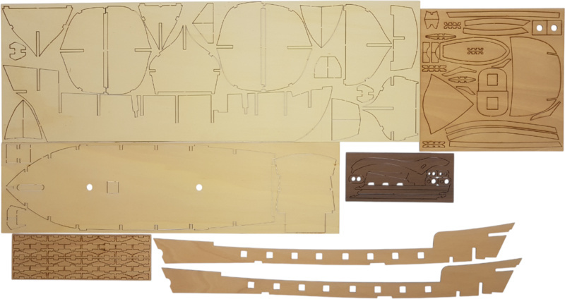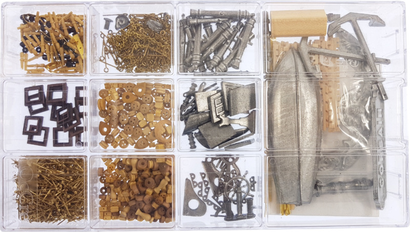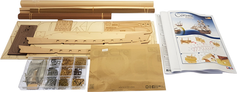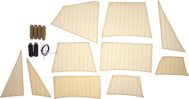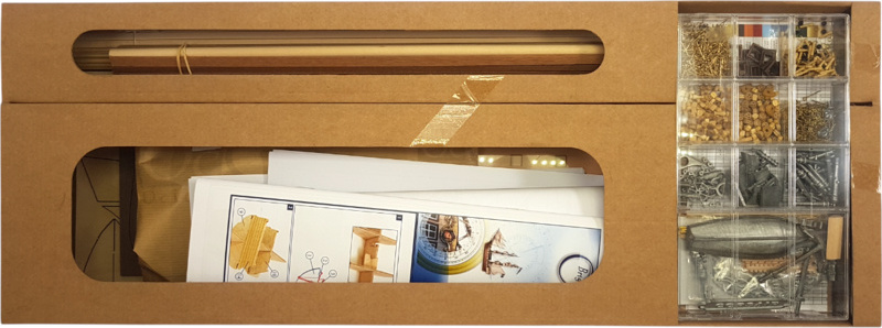 L'emballage contient des pièces en bois découpées au laser, des lattes, des mâts, des pièces en bois usinées, des pièces en métal, des pièces en laiton, des cordages, des voiles cousues, un support. Manuel et plans de construction.