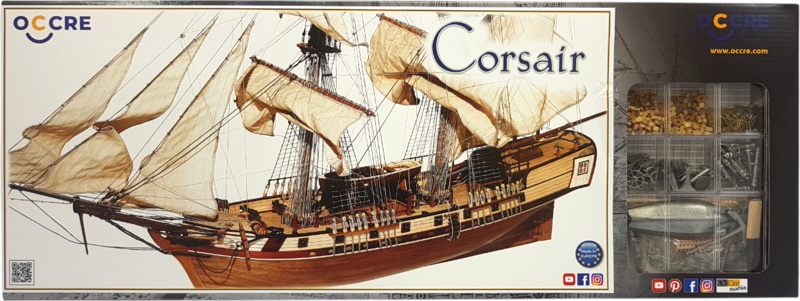 Kit de construction du modèle de bateau Corsair à l'échelle 1:80 de la marque OCCRE. Un navire marchand qui est tombé entre les mains des corsaires et qui était équipé de 16 canons et de 4 falconets. Construction principalement en bois, les pièces planes sont découpées avec précision au laser. La coque est classique avec des membrures. Le plaquage est double. Un support avec une plaque en métal moulé portant le nom du bateau est inclus pour exposer le navire. La riche décoration du bateau se présente sous forme de pièces métalliques, telles que des canons, une ancre, un canot, un gouvernail et des éléments décoratifs. Divers cordages sont inclus pour le gréement. Les voiles cousues simplifient la construction. L'avantage de ce kit est son emballage de haute qualité avec des pièces bien protégées, un manuel illustré étape par étape et un ensemble de plans. Convient aux modélistes légèrement avancés et ambitieux.