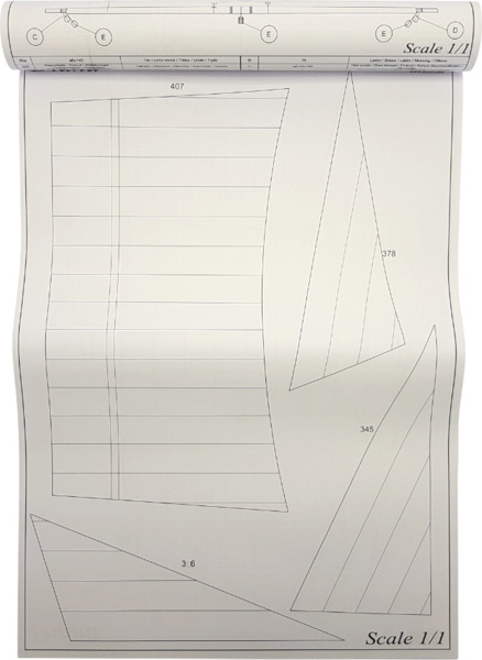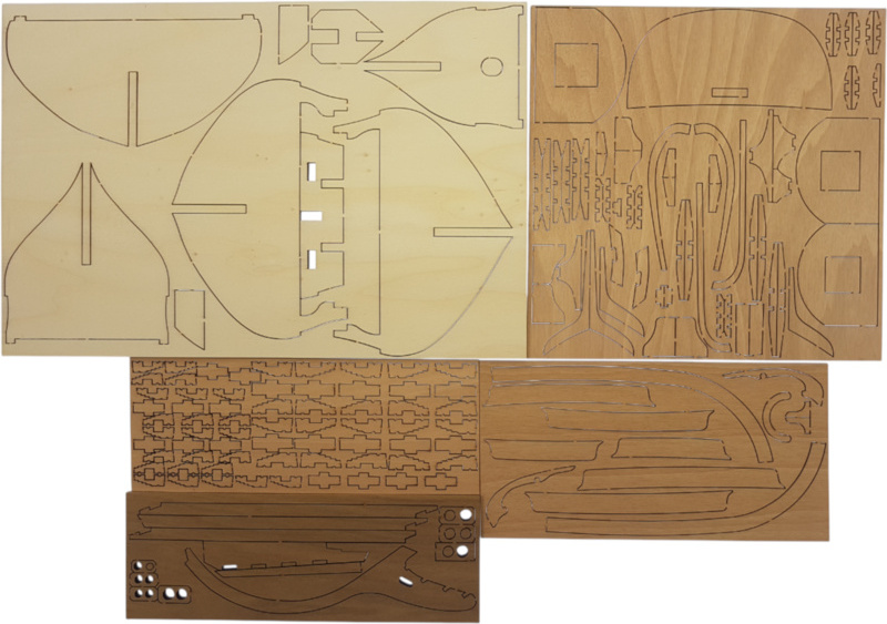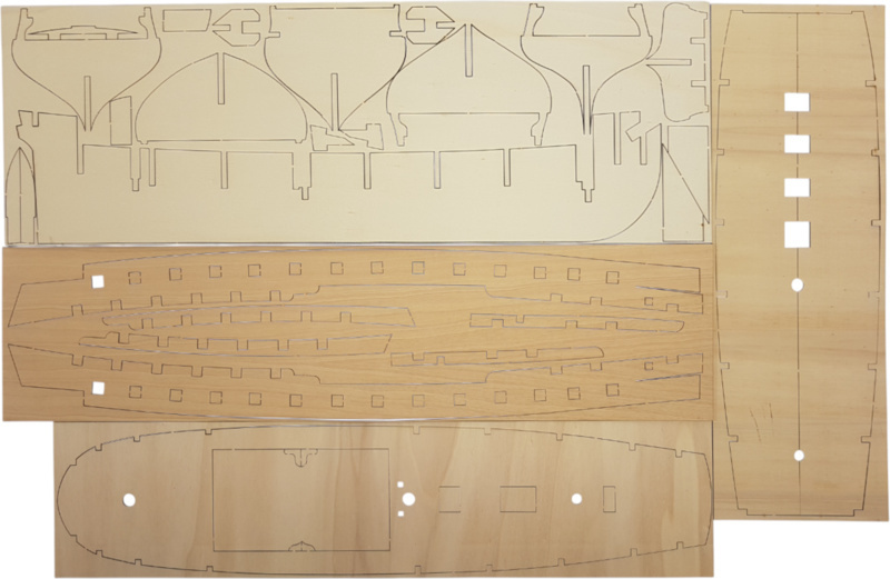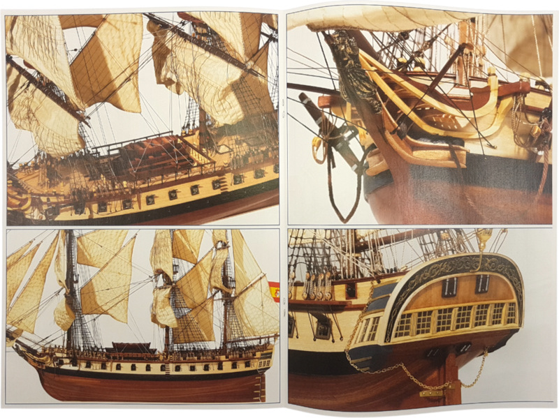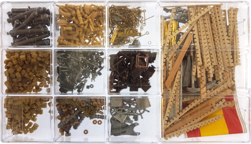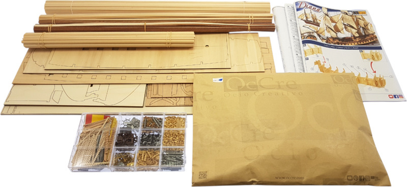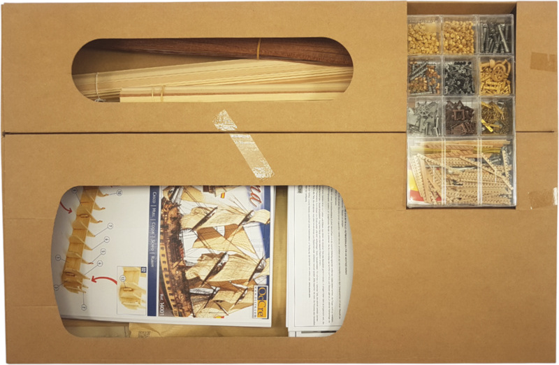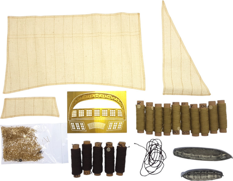 L'emballage contient des pièces en bois découpées au laser, des bordages, des mâts, des pièces en bois usinées, des pièces métalliques, des photodécoupes en laiton, des cordages, des voiles cousues, un drapeau. Manuel et dessins de construction.