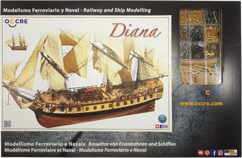 Kit de construction du modèle de bateau non flottant Diana de la marque OCCRE à l'échelle 1:85. Frégate militaire espagnole avec un armement puissant, servant dans la lutte contre la France révolutionnaire et plus tard contre la Grande-Bretagne. Construction principalement en bois, les pièces planes sont découpées avec précision au laser. La coque est classique avec des membrures. Le bordage est double. Le modèle comporte de nombreux détails, y compris des pièces métalliques telles que des canons, des ancres, des canots, des grilles de fenêtres, ou une figure de proue et d'autres éléments. La poupe est ornée de photodécoupes en laiton. Pour le gréement, divers cordages sont inclus dans l'emballage. Les voiles cousues facilitent la construction. L'avantage est un emballage de premier ordre, un manuel illustré, un ensemble de dessins.