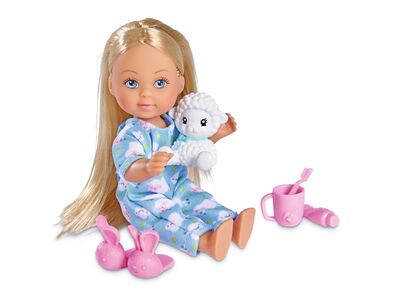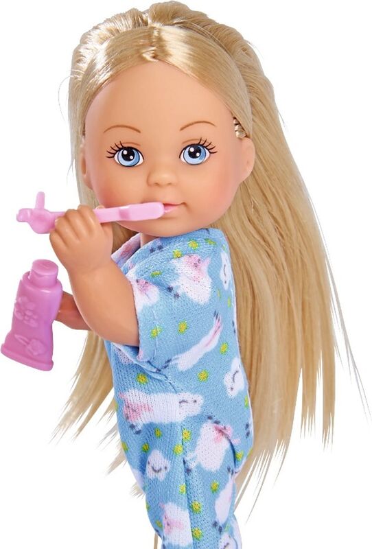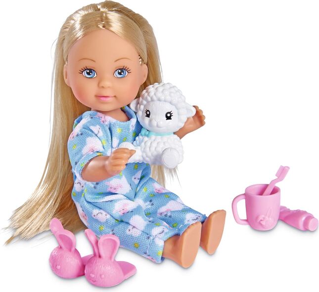 La poupée Evička en mignonne pyjama avec des chaussons, avec son petit mouton, une brosse à dents, du dentifrice et une tasse.