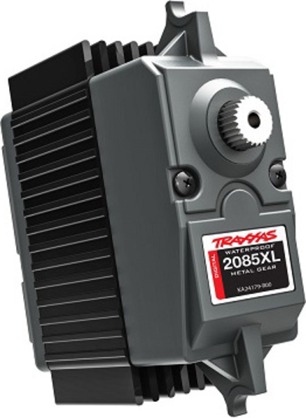 Servo numérique puissant Traxxas 2085XL, taille Maxi, étanche*, pignons en métal, corps central en aluminium, roulements à billes, couple de 32 kg.cm, vitesse de 0,13 s/60°, poids de 125g, dimensions : 61x26x64mm. Hexagone 25T. Câble plus long de 19 cm par rapport au servo 2085X (12cm).